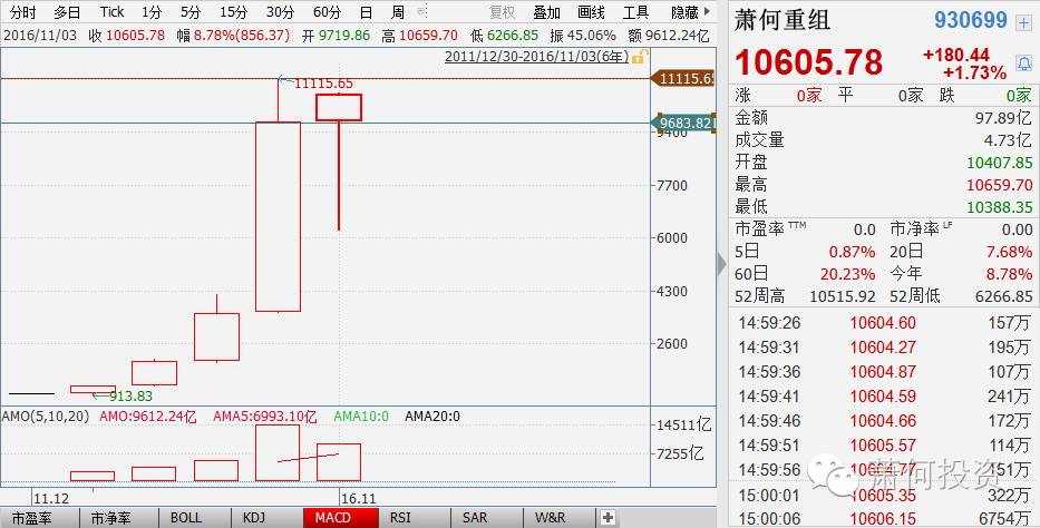 今日,伴随着股市大盘的回升,中证萧何重组预期60指数(930699)轻松上涨,远超大盘指数升幅的同时再度创出今年新高。日内最高到10659.70点,收盘收在10605.78点。 日K线的表现上已经走出了4连阳,今日的阳线实体明显较长,相比昨日收盘涨180.44点,涨幅1.73%。股灾3.0以来(春节后),涨幅大幅战胜宽基指数。全年涨幅8.78%,成为中证指数系列中涨幅最大的指数。 萧何重组指数从基期(2011年12月30日)以来4年多的时间,累计上涨9605.78点,涨幅9.6倍。其中每年都实现了可观的涨幅,年度K线皆为阳线,2015年,股灾之年甚至获得了171%的上涨。 呵呵!看到指数这样的表现,心都醉了! 指数化投资本是一种让人省心的投资,虽然大盘指数不尽人意,若能投资于萧何重组预期指数,你可以大胆将你的心思投放到欣赏这窗外如锦的秋色去了。 但提醒一点:要有耐心,拿的久,禁得住折腾,即使出现像去年的股灾也要拿住不放。因为指数化投资的核心是长期投资。。。它的交易纪律就是拿住,别动,等。 |